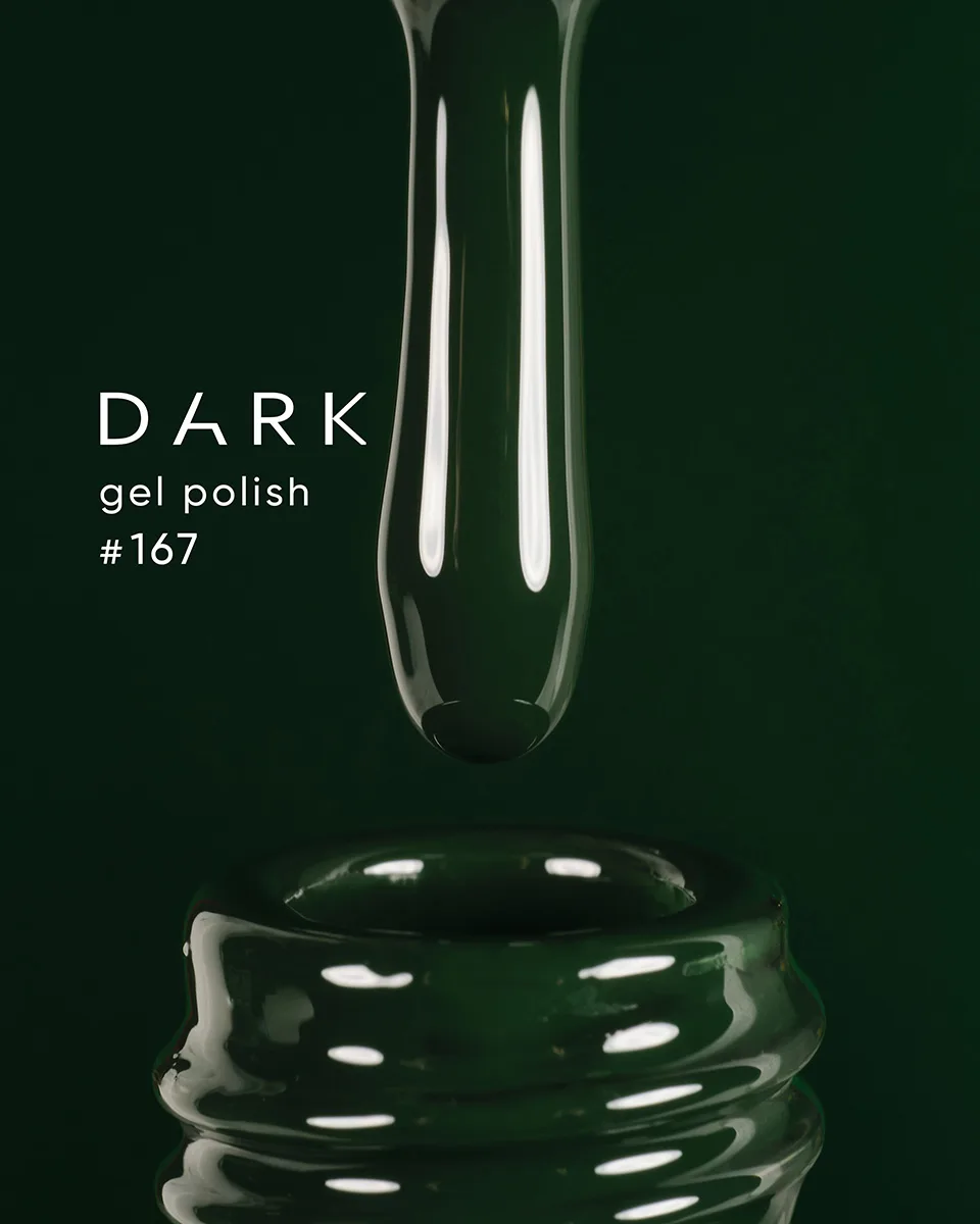 DARK Gel Polish 167 to profesjonalny lakier hybrydowy w głębokim, ciemnozielonym odcieniu, należący do szerokiej palety kolorów marki DARK. Starannie dobrana formuła oraz intensywna pigmentacja sprawiają, że kolor prezentuje się elegancko i nowocześnie, idealnie wpisując się w aktualne trendy stylizacji paznokci.