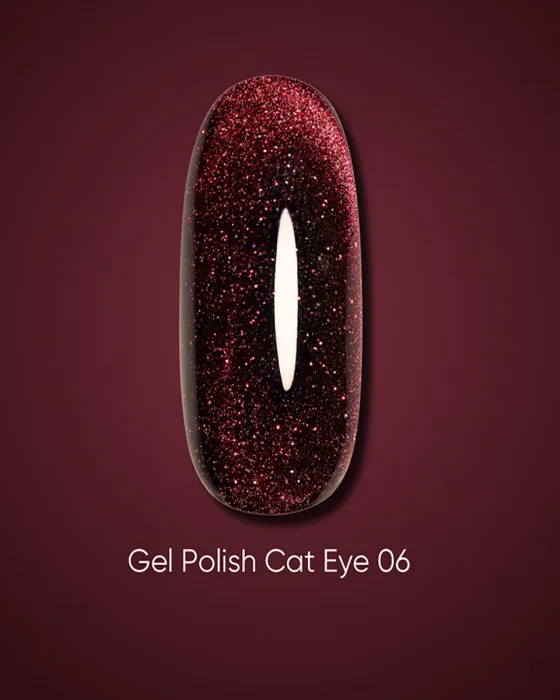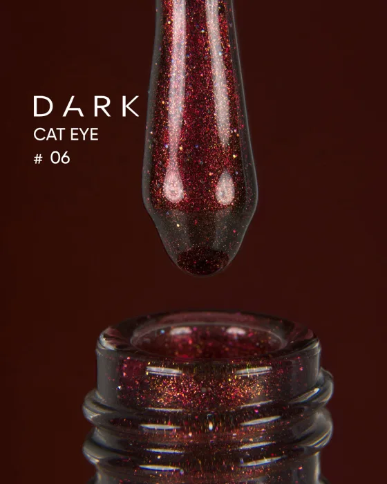 DARK Gel Polish Cat Eye 06 to bordowy lakier hybrydowy kocie oko o głębokim, eleganckim charakterze. Ciemny odcień bordo w połączeniu z magnetycznym efektem światła nadaje manicure luksusowy wygląd.