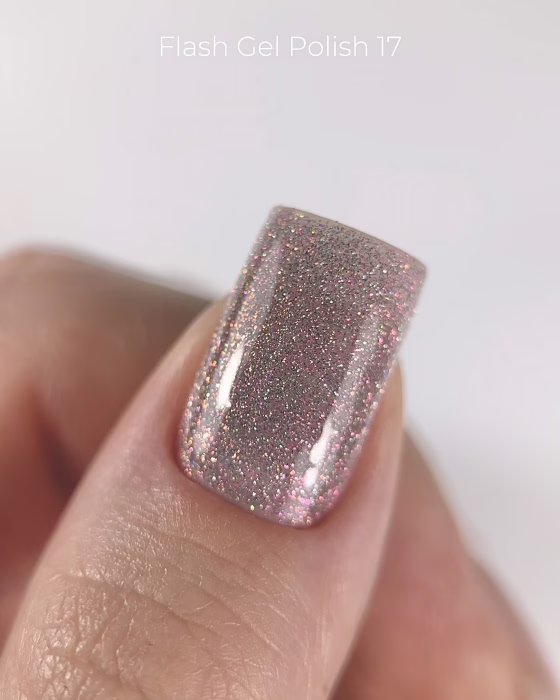 Dark Gel Polish Flash 17 to wyjątkowy lakier hybrydowy z drobinkami w eleganckim lawendowo-różowym odcieniu. Dzięki refleksyjnym cząsteczkom tworzy efekt lakieru brokatowego flash – manicure rozświetla się przy sztucznym świetle i fleszu, nadając paznokciom subtelny, a jednocześnie niezwykle efektowny blask.
