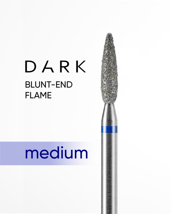 DARK Frez Płomień niebieski 2,4×10 mm to frez o kształcie płomienia z zaokrągloną, nieostrą końcówką, przeznaczony do pracy przy skórkach oraz wale okołopaznokciowym. Niebieskie oznaczenie wskazuje na średnią gradację.