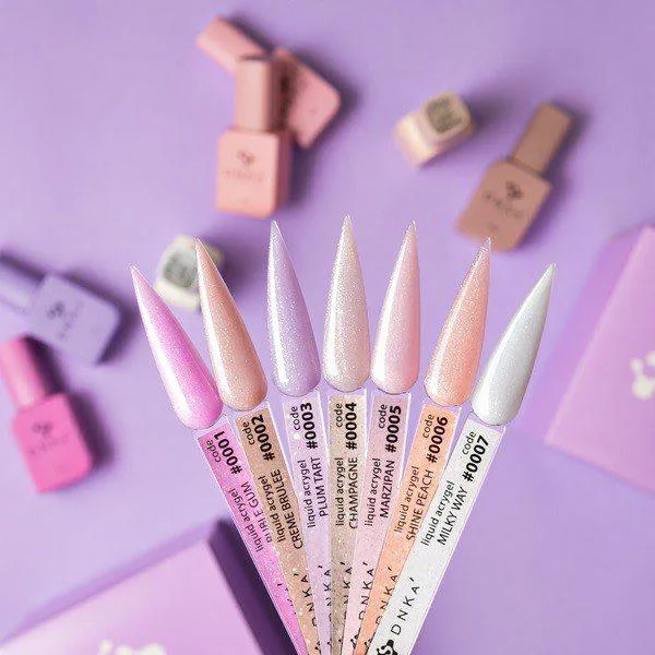 DNKA’ Liquid Acrygel to linia płynnych żeli stworzonych do wzmacniania płytki paznokcia. Dzięki niskiej kwasowości, płynny akrylożel jest całkowicie bezpieczny dla paznokci. Idealnie nadaje się do cienkich i wrażliwych paznokci oraz ma średnią konsystencję. Świetnie wyrównuje i wzmacnia zarówno krótkie, jak i długie paznokcie. Żel nie ulega deformacji podczas noszenia i utrzymuje doskonały połysk aż do momentu korekty. Aby zapewnić lepszą przyczepność do płytki paznokcia, zaleca się stosowanie DNKA’ Rubber Base jako bazy, nakładanej cienką warstwą.