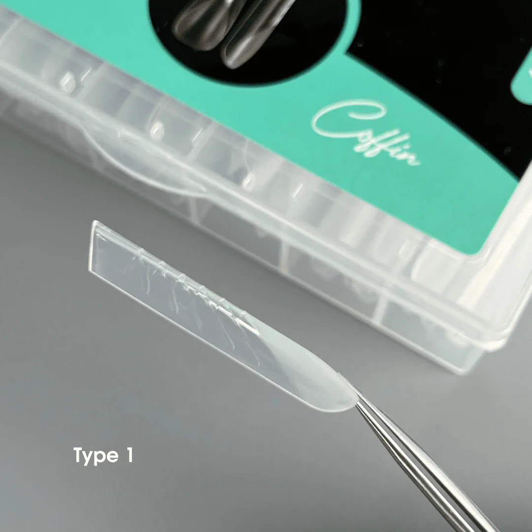 Type 6 – łukowaty kwadrat do częściowej korekty/przedłużania, 120 sztuk. Zestaw 120 sztuk zawiera 12 rozmiarów, co ułatwia dobranie odpowiedniego kształtu do każdej płytki paznokcia.