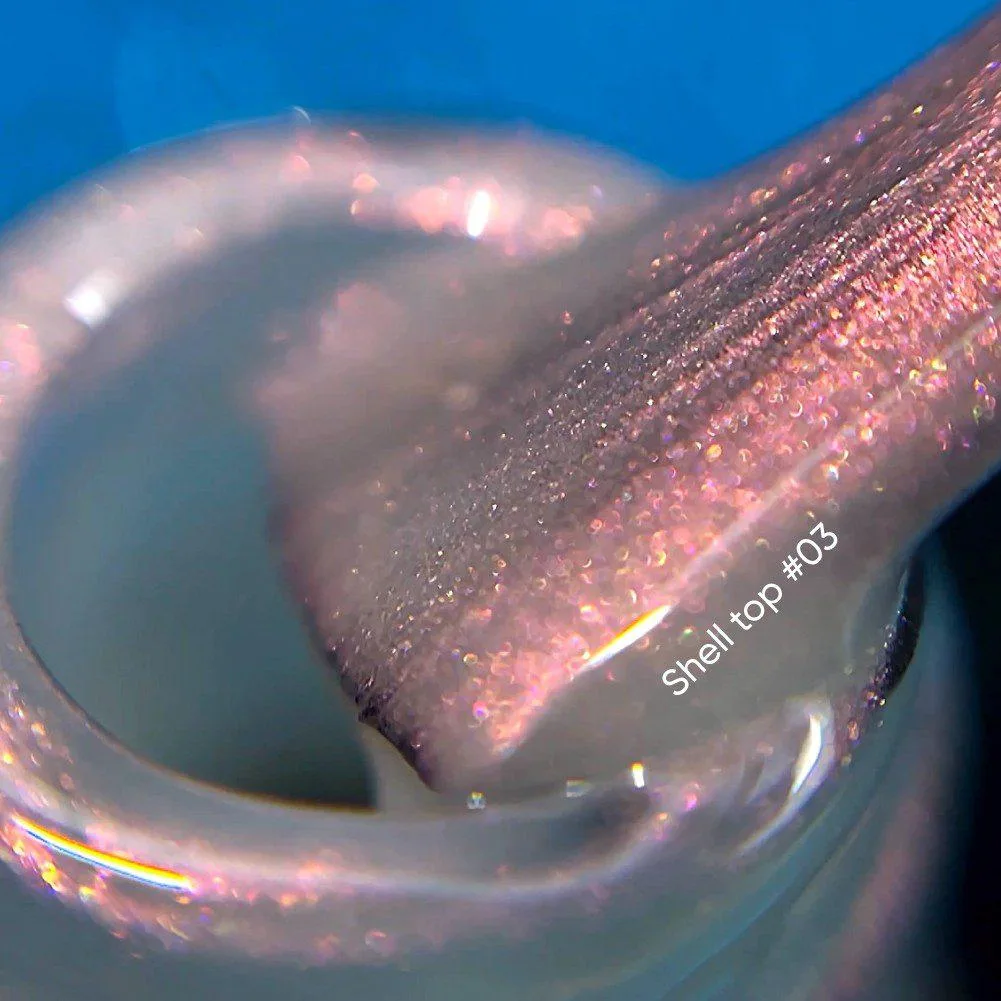 NAILSOFTHENIGHT Shell Top 03 to innowacyjny top hybrydowy bez lepkiej warstwy, który łączy w sobie efekt perłowy i efekt pyłku w jednym produkcie. Dzięki temu, zapomnij o skomplikowanym trzystopniowym wcieraniu pyłku i problemach z odpryskami. Teraz możesz cieszyć się pięknymi, modnymi paznokciami w jednym prostym kroku.