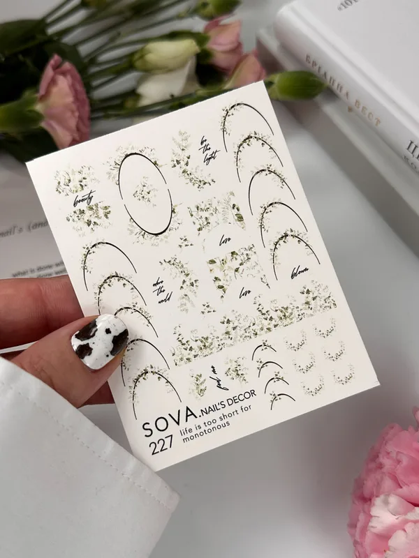Stwórz stylowy, elegancki manicure z nutą natury dzięki naklejkom Sova Decor №227. Zielone listki i gałązki doskonale komponują się z klasycznym frenchem oraz nude i pastelowymi odcieniami, dodając świeżości i subtelności. Idealny wybór zarówno na co dzień, jak i na wyjątkowe okazje.
